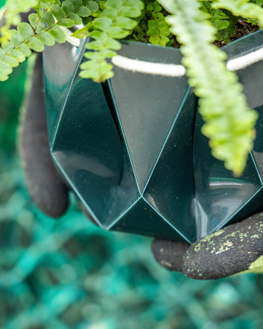 Geometric teal self-watering ocean pot with a plant and packaging on a white background