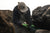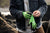 Person putting on green gardening gloves for a beach clean in a rocky setting.